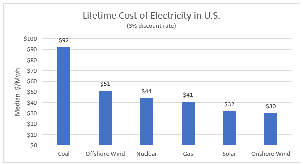 As of 2020, projections had nuclear at about the same cost as natural gas. And it costs less than coal and offshore wind.