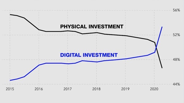 Which is why businesses are accelerating their investments in new technology … putting billions into this new digital world. Last year, for the first time ever, digital investments surpassed physical investments…