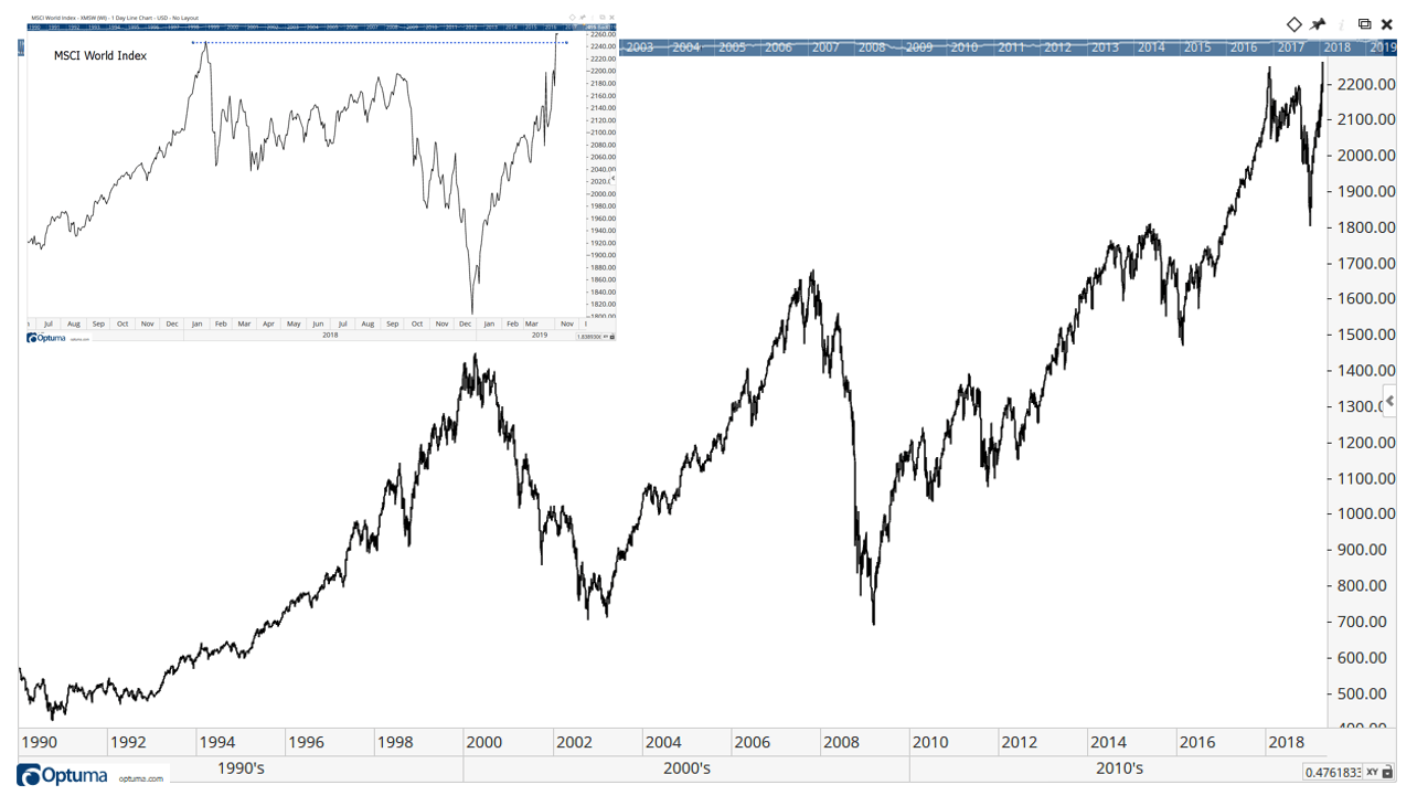 The chart below shows the MSCI World Index — which represents large- and mid-cap equity performance across 23 developed markets — while the inset highlights its recent breakout to new highs.