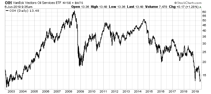 The chart below shows the VanEck Vectors Oil Services exchange-traded fund from 2003 until now. The fund holds major oil service companies.