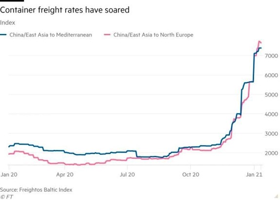 And that’s exactly what they do. Here’s what happened to container shipping rates at the beginning of the year. A lot of the inflation everybody hates is due to these rising rates: