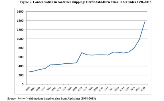 Note the enormous spike in concentration starting in 2016 … just when some of the biggest mega ships were commissioned (hint: it’s not a coincidence). Three shipping cartels control 80% of the global market: